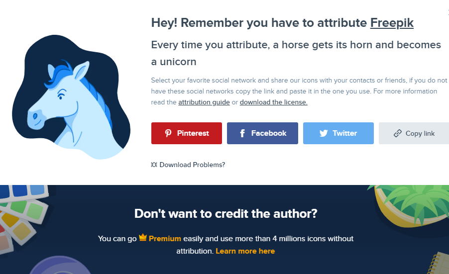How to attribute it? In order to use an icon you must attribute it to its author, so we will be able to continue creating new graphic resources every day. Icon made by [author link] from www.freeicons.io E.g.: Icon made by Free icons from www.freeicons.io